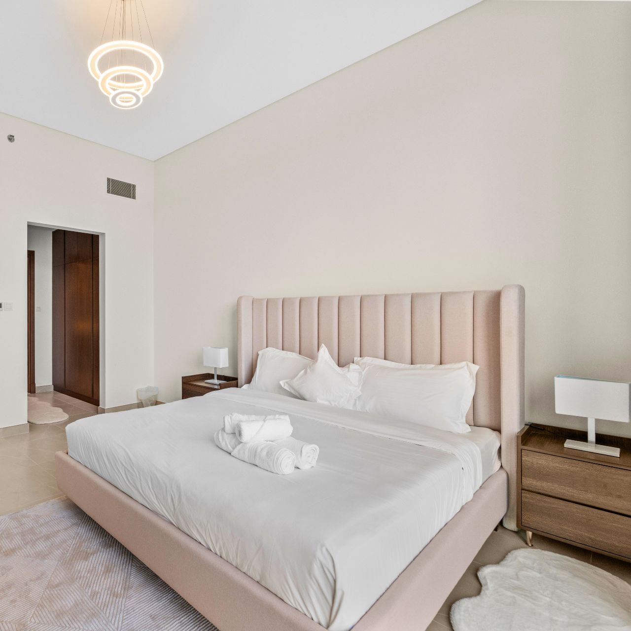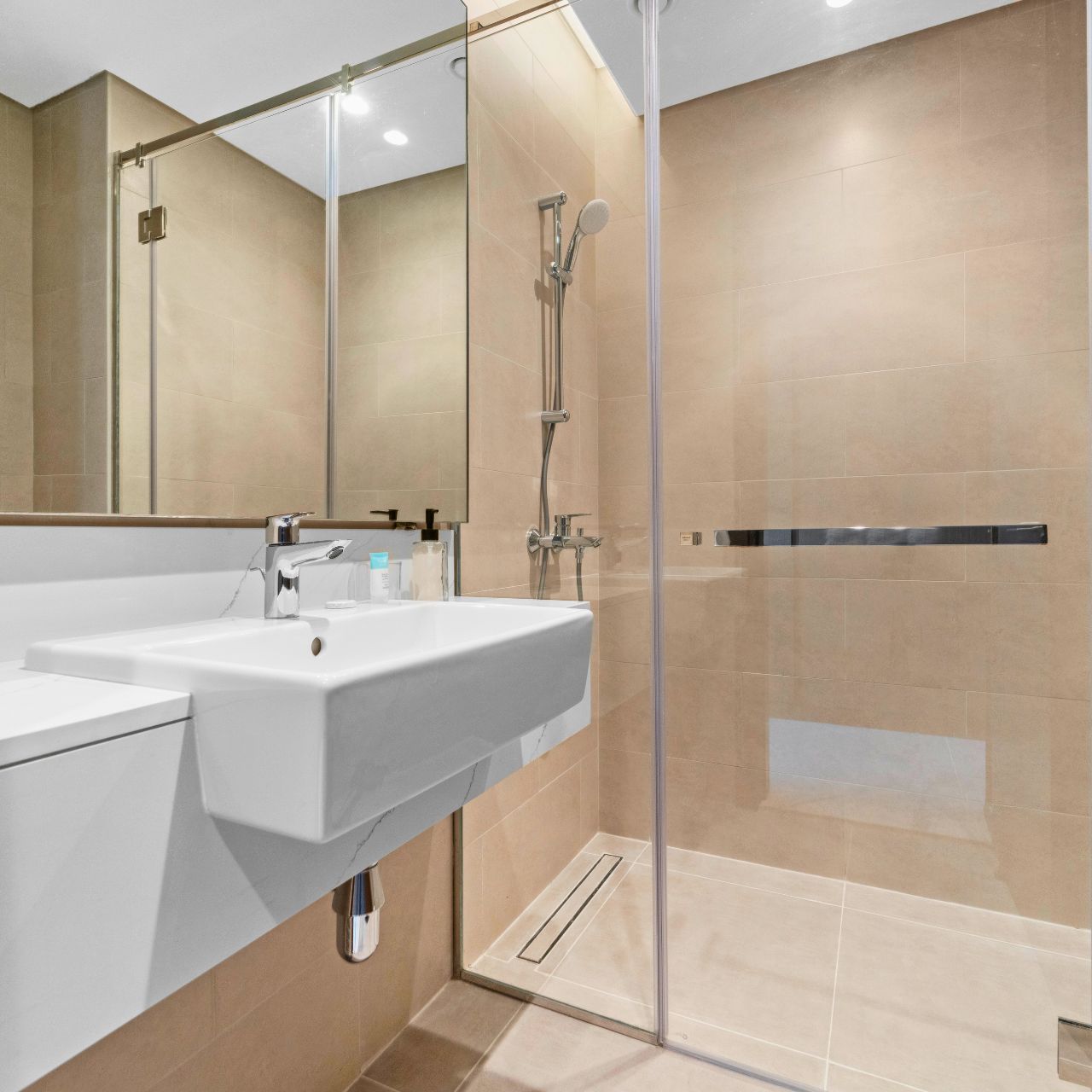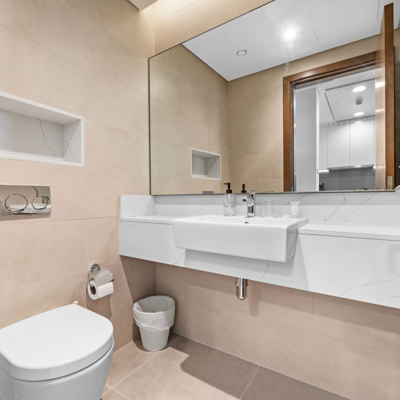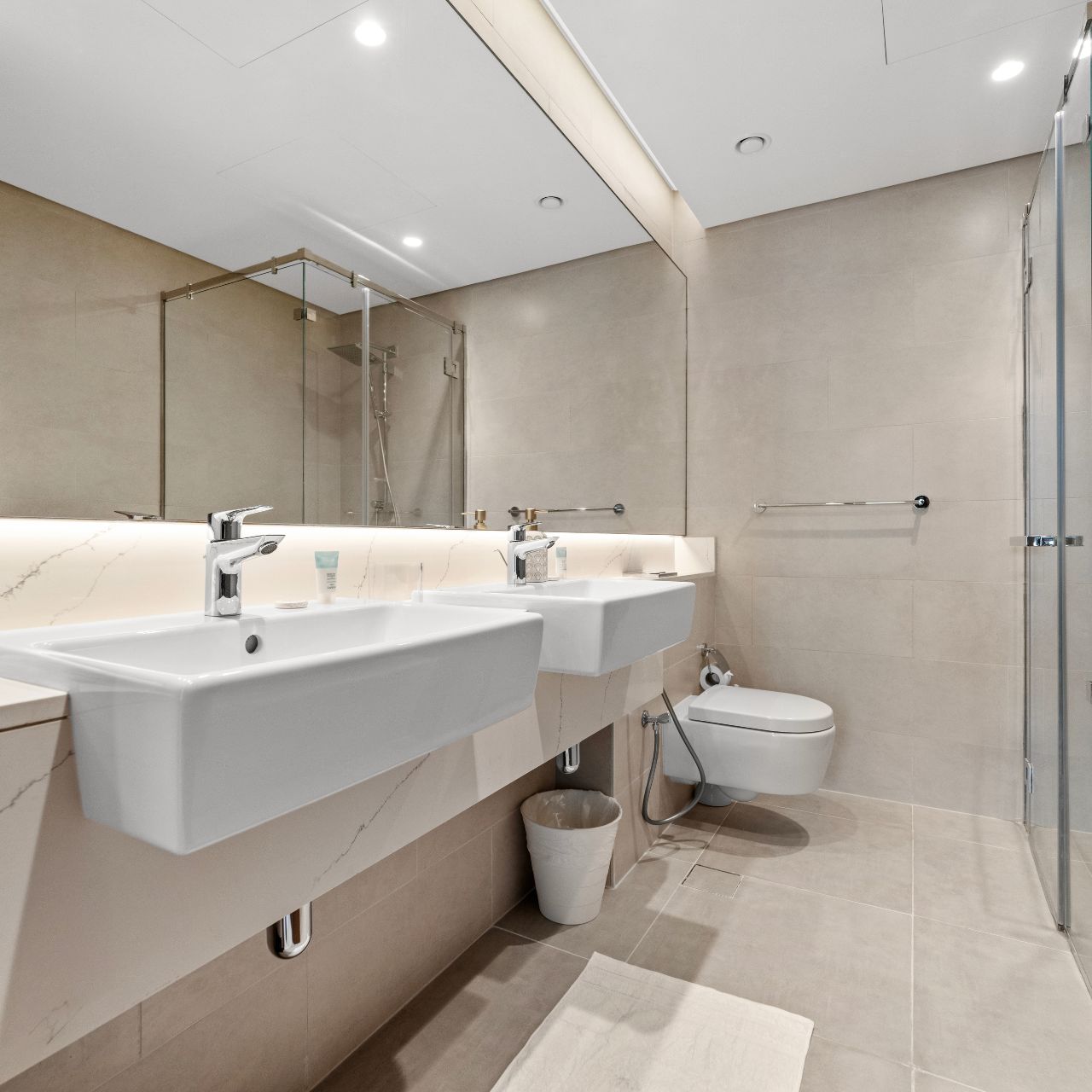 The two large bedrooms are thoughtfully designed with built-in wardrobes, en-suite bathrooms.