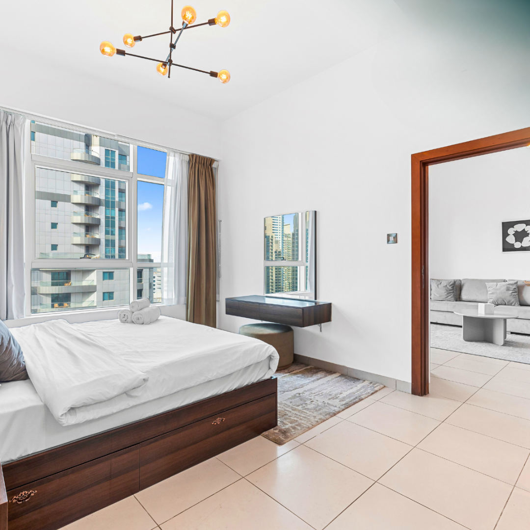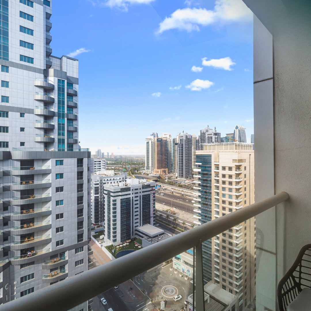 Step outside onto the private balcony and be captivated by panoramic views of the Dubai Marina skyline and the azure waters of the Arabian Gulf. Whether you’re enjoying your morning coffee or unwinding with a glass of wine at sunset, this outdoor space provides the perfect backdrop for moments of serenity and contemplation.