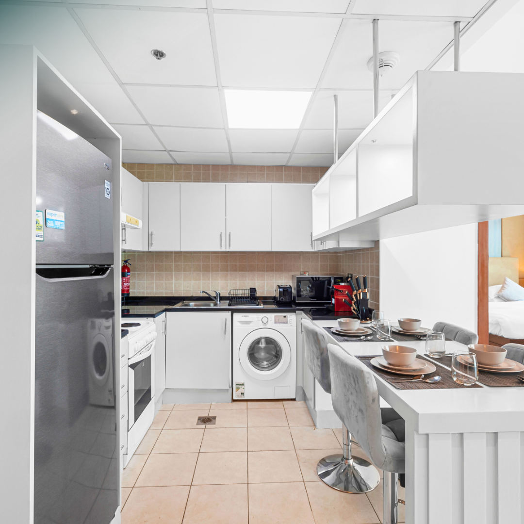 The kitchen is a chef’s delight, The master bedroom is a sanctuary of comfort, featuring large windows that frame mesmerizing views of the marina.